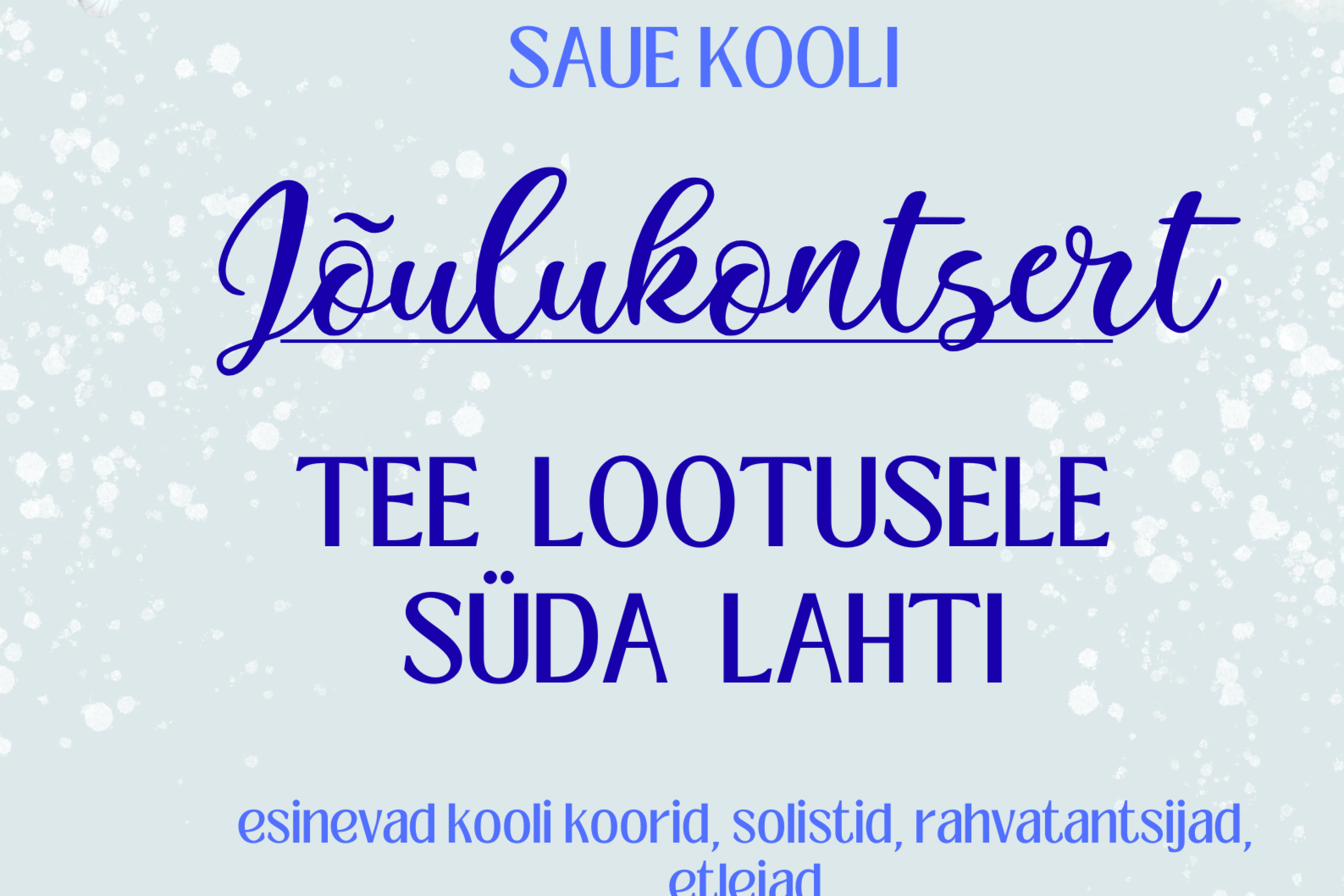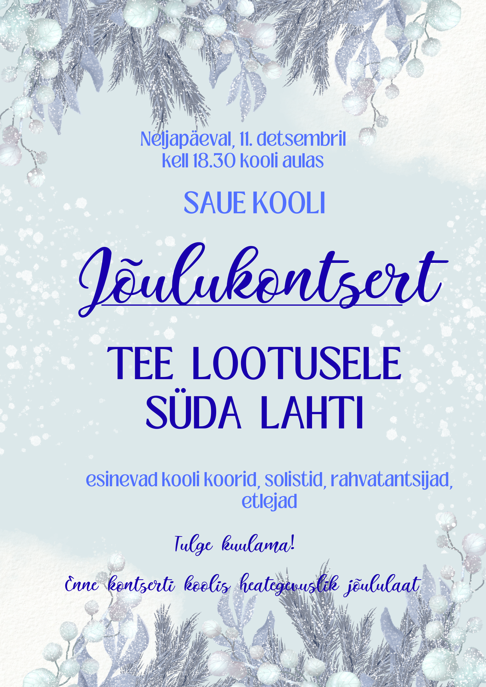 Neljapäeval, 11. detsembril algusega kell 18.30 kooli aulas jõulukontsert. Esinevad 1. klassi Väikeste Tüdrukute Koor, 2. - 4.klassi Väikeste Tüdrukute Koor, 5. - 9. klassi lastekoor, solistid, rahvatantsijad, etlejad.