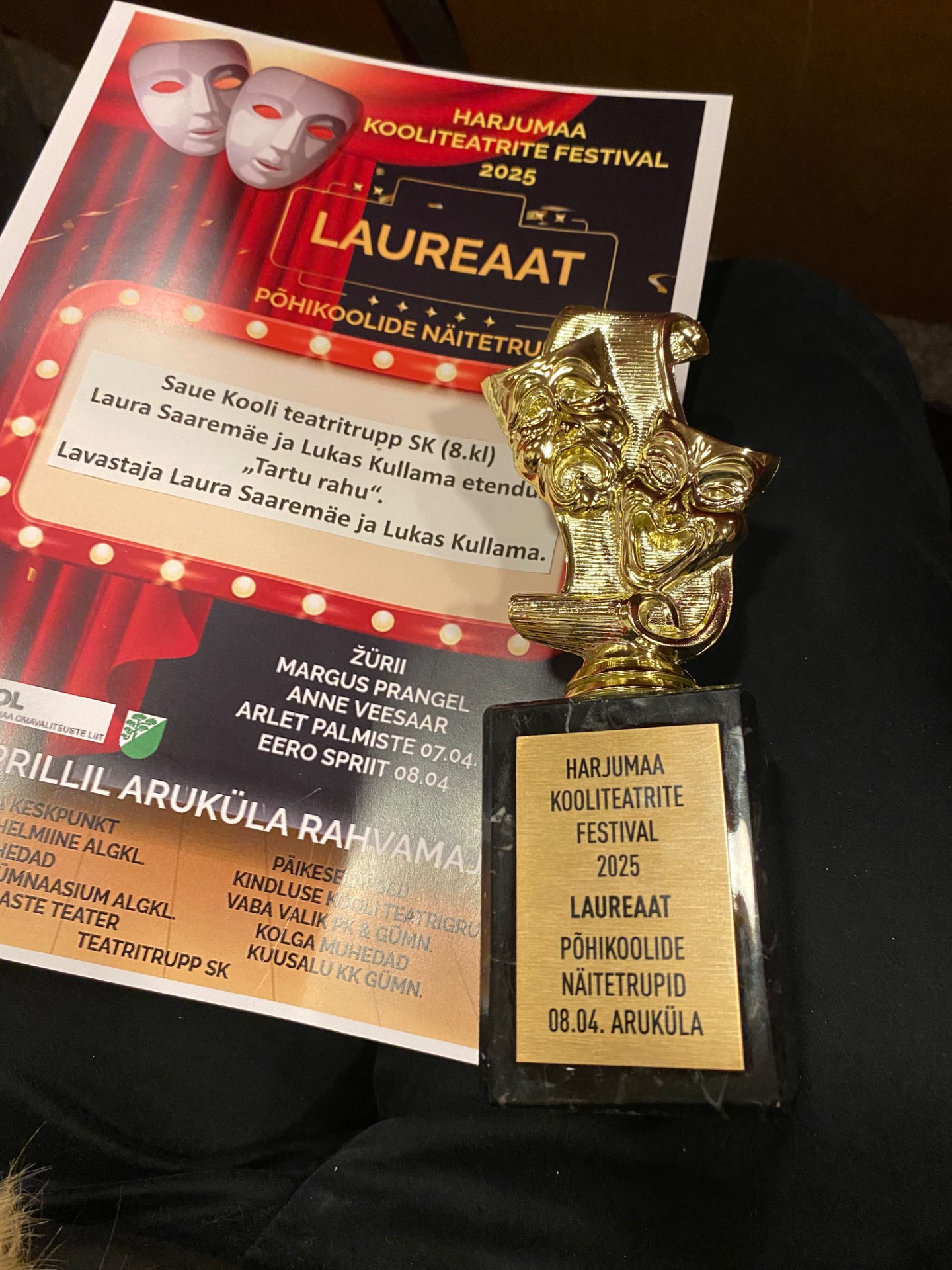 Žürii, kuhu kuulusid Anne Veesaar, Eero Spriit ja Margus Prangel, andis meile julgustavat ja kiitvat tagasisidet. Saime kolm kuldset teatrinägu: parima meesnäitleja – Lukas Kullama; parima meeskõrvalosatäitja – Hugo Strandson ja festivali laureaat. Näitetrupi juhendaja õp. Laura Saaremäe.