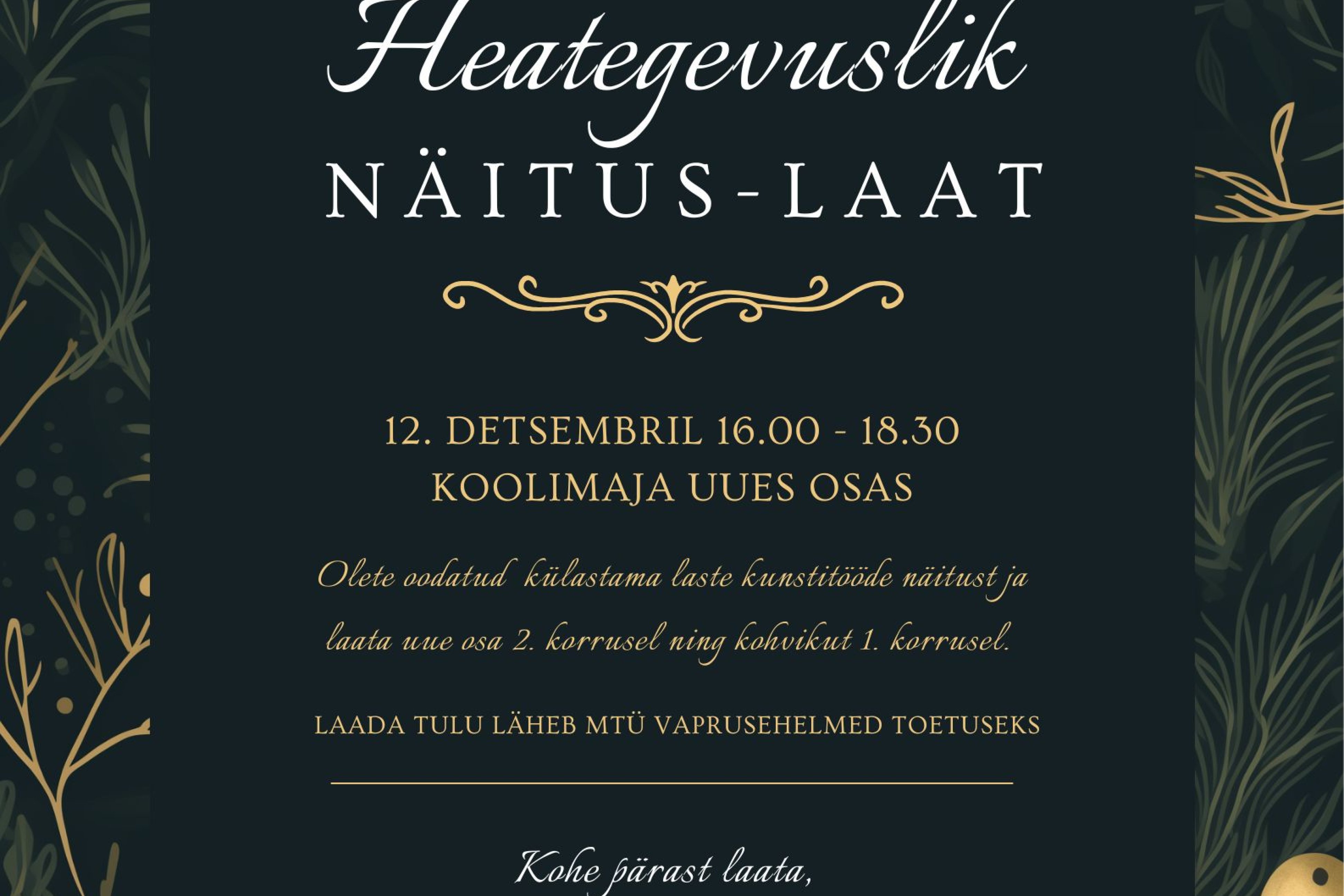 Neljapäeval, 12.12 kell 16.00 - 18.30 koolimaja uues osas heategevuslik näitus- laat. Avatud kohvik. Kell 18.30 aulas kooli jõulukontsert. Esinevad kooli koorid, solistid, ansamblid, rahvatantsijad, etlejad. Sissepääs vaba.