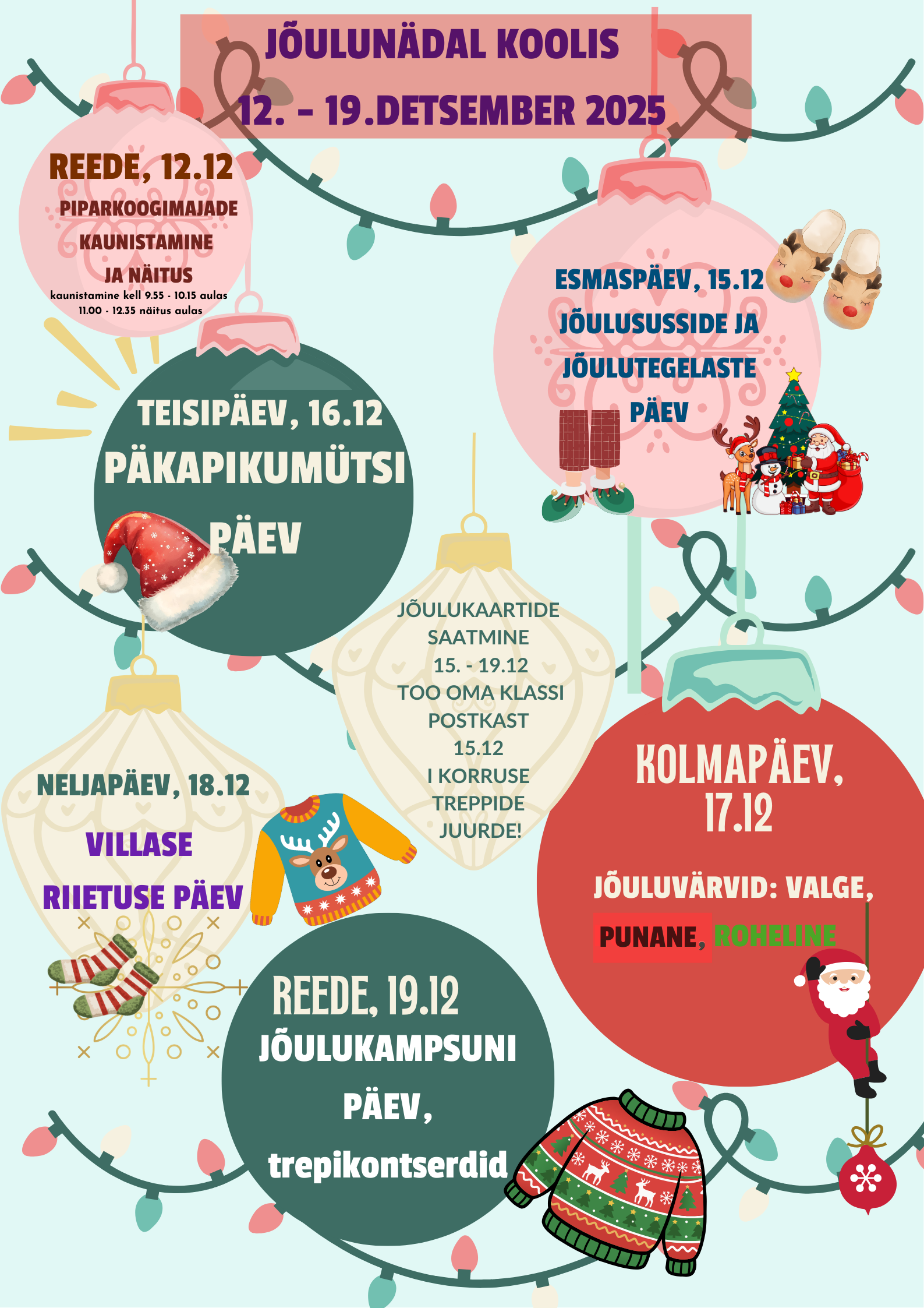 - 15. – 19.dets. - JÕULUKAARTIDE SAATMINE KOOLIKAASLASELE. Igal klassil võimalus tuua omavalmistatud postkast I ja II korruse vahele pinkidele ja saata oma klassi – ja/või koolikaaslasele jõulutervitus. Postkast ära võtta hiljemalt 19.detsmber.